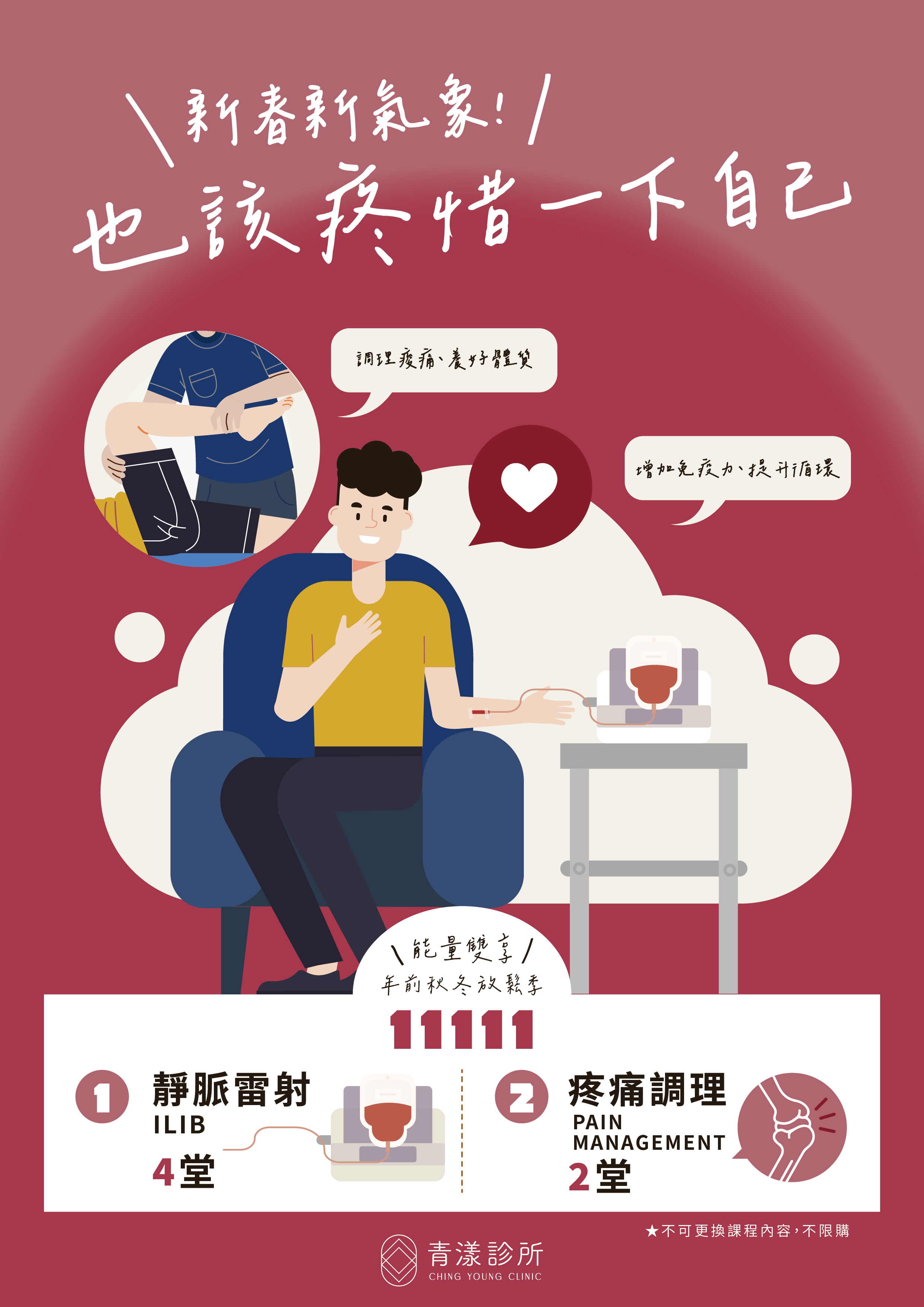 2026.01.01 最新消息 新春新氣象🏮也該疼惜一下自己! 新春新氣象🏮也該疼惜一下自己! 適合現代人精神消耗過多、壓力過大、容易疲倦,補充能量讓你活力滿滿! ★5星舒適就診體驗,全方位調理養護 預防醫學權威 鄭榮耀 醫師駐診 婦科及抗衰老專家 蔡俊堅 醫師駐診 專業疼痛調理師 Nick 提供客製化醫護美療服務 加LINE好友 ⟠ 享受1對1專屬諮詢 ➢ https://lin.ee/stwuFKn | @chingyoung